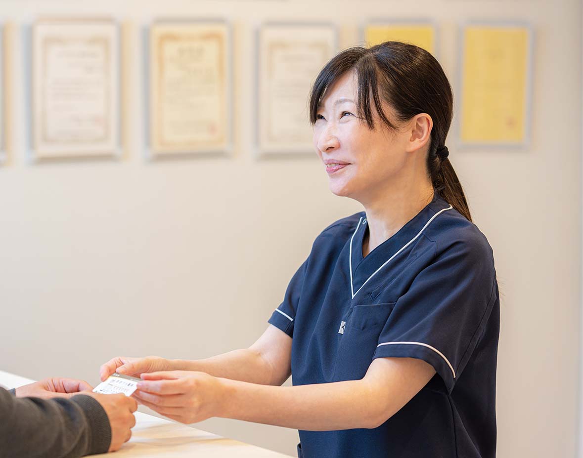 まず基本的には受付を担当していただきます。当院の受付マネージャーから1対1で受付(保険証入力、マイナンバー確認)~会計~予約をマスターしていただくことになります。入職後3冊のマニュアル(医療事務・検査・手術)をお渡ししますので、それを読みながらすこしずつ知識を増やしていってください。この期間はパートタイム(時給制)です。入職前から入職2週間までは有休消化中の兼務が可能なので、そのようにしたい方はご相談くださいませ。