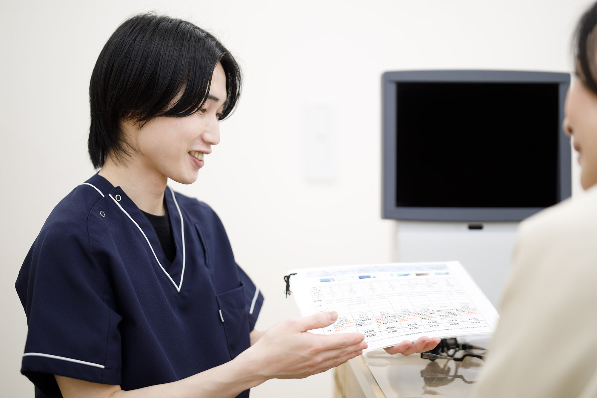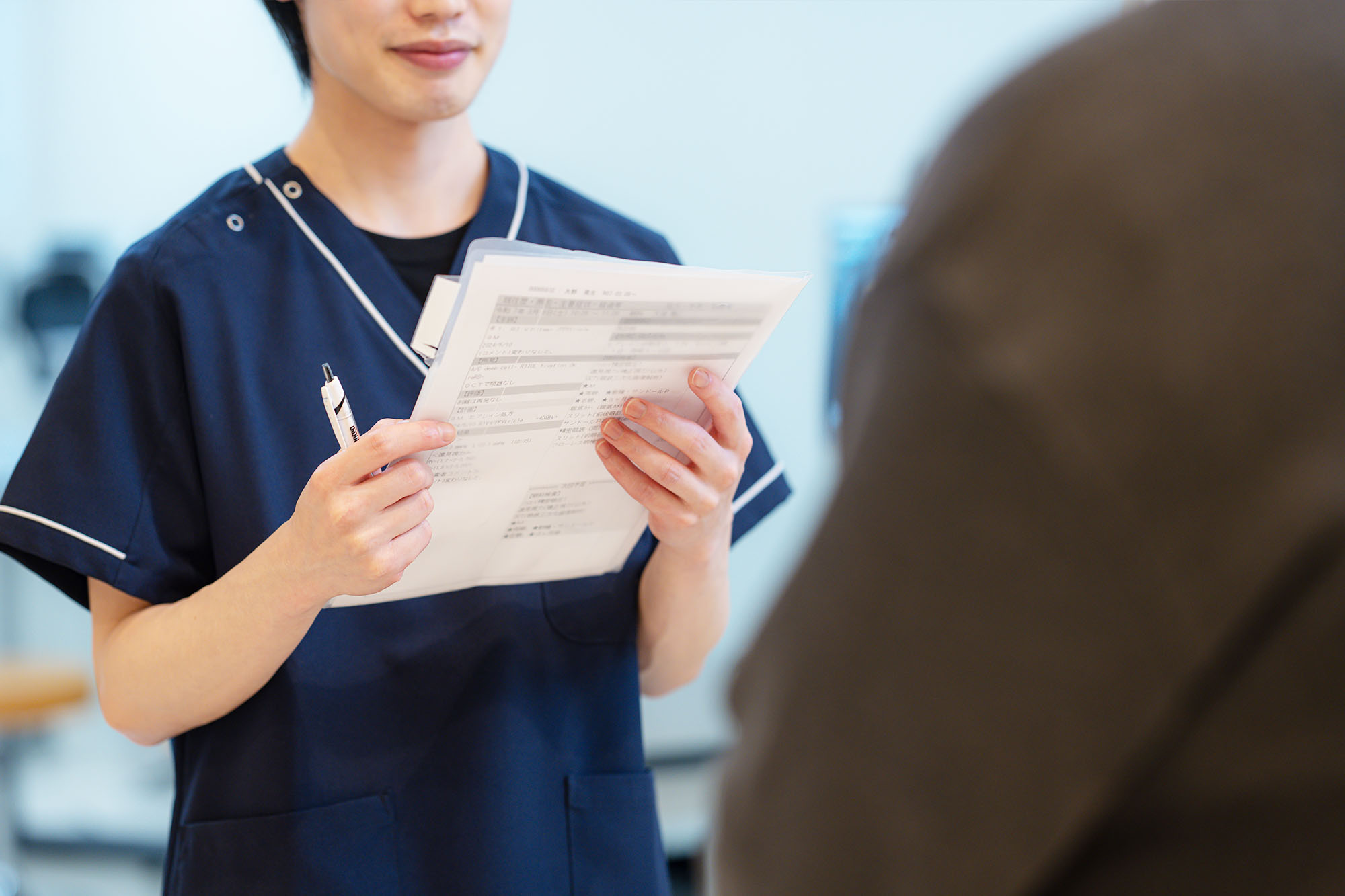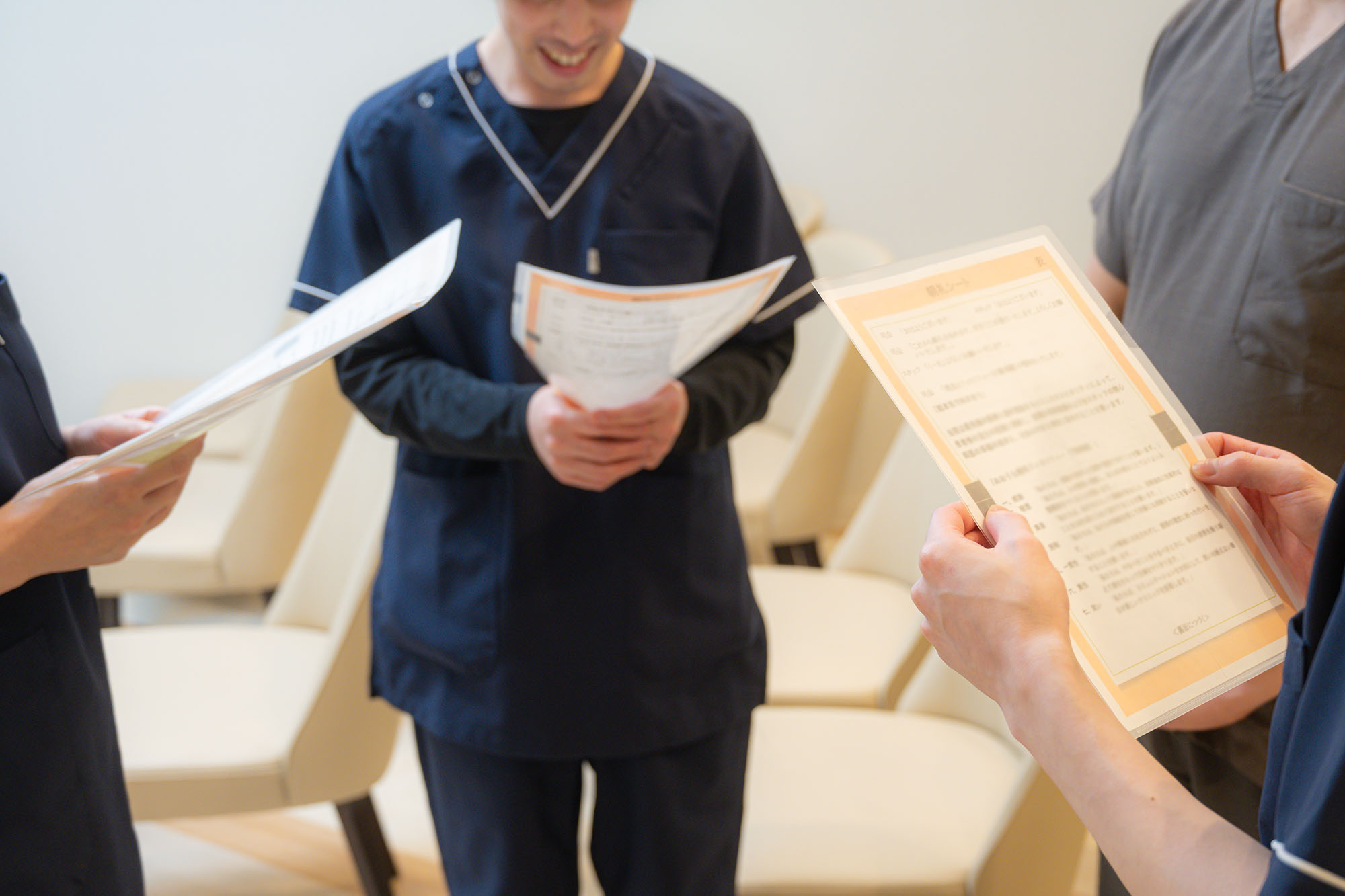 入職が決まると、入職前から入職直後に接遇研修を業務委託している株式会社C-planの講師による入職前研修があります。また院長より理念研修があり医療者・社会人としての心構えを新たにして入職していただきます。その後、業務については業務マニュアルがあるためそれに従って予習や復習をしていただき、業務中はマニュアルを参照しつつ、同僚の検査員がマンツーマンで指導します。また振り返りシートで日々の疑問や気づきを共有して解決していきます。業務でわからないことがあった場合は、すぐに相談できる体制があり、必要に応じて交代して患者対応します。